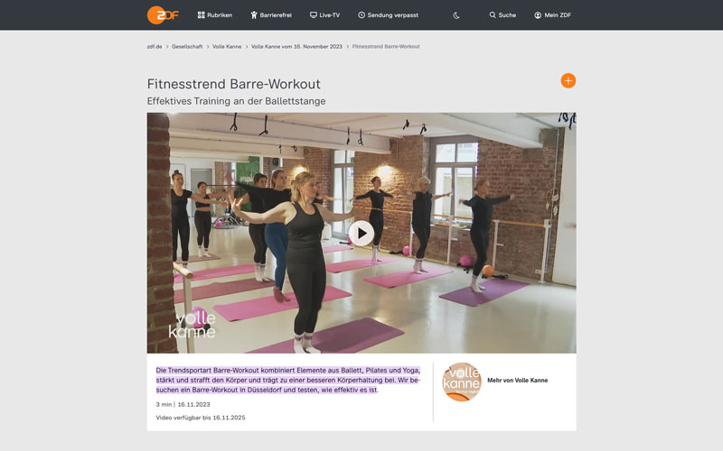 Whoop! Diesmal im ZDF. Das „Volle Kanne„ Team hat einen Beitrag über unser Barre Workout produziert und sich dafür bei uns gemeldet um ausführlich mehr darüber zu erfahren. Conni und Nina kommen auch als Expertinnen zu Wort. Schaut selbst, viel Spaß!